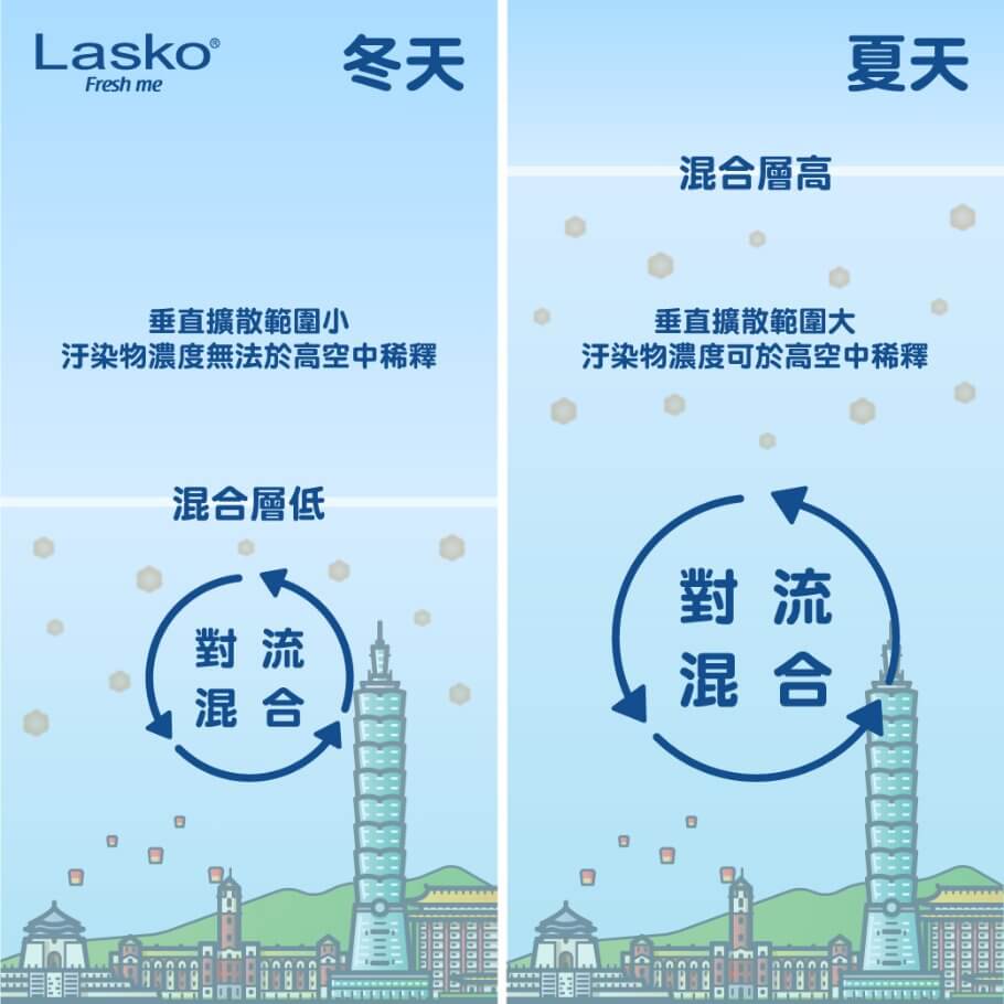 冬天空氣品質較差,與混合層高度較其他季節低有很大的關係!混合層高度 (Mixing layer height) 是表示空氣污染物在混合層中垂直方向可擴散的高度,可表達環境大氣對空氣污染物傳輸與擴散的效果。冬季空氣中的污染物可擴散的垂直範圍愈小,混合層高度低,不易將污染物向垂直方向擴散,近地面的污染物濃度不易降低。